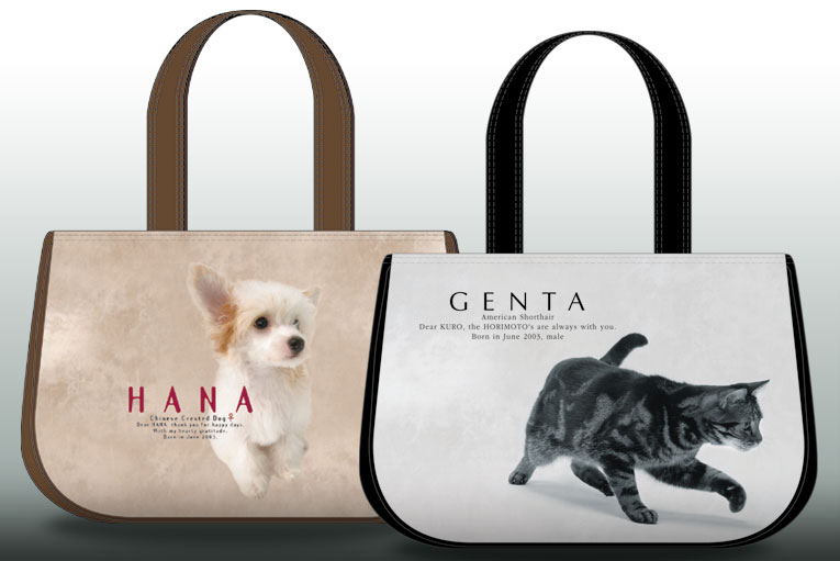 | ペットの名前、品種、性別、生年月日あるいは没年といった、 お客様固有のオリジナル情報が、写真とともにカッコよくデザインされたグレード感。 バッグのデザインもオリジナル。しかもプリントしてからプロが縫製する手作りバッグです。 何から何までこだわった最高の逸品をお楽しみください! |